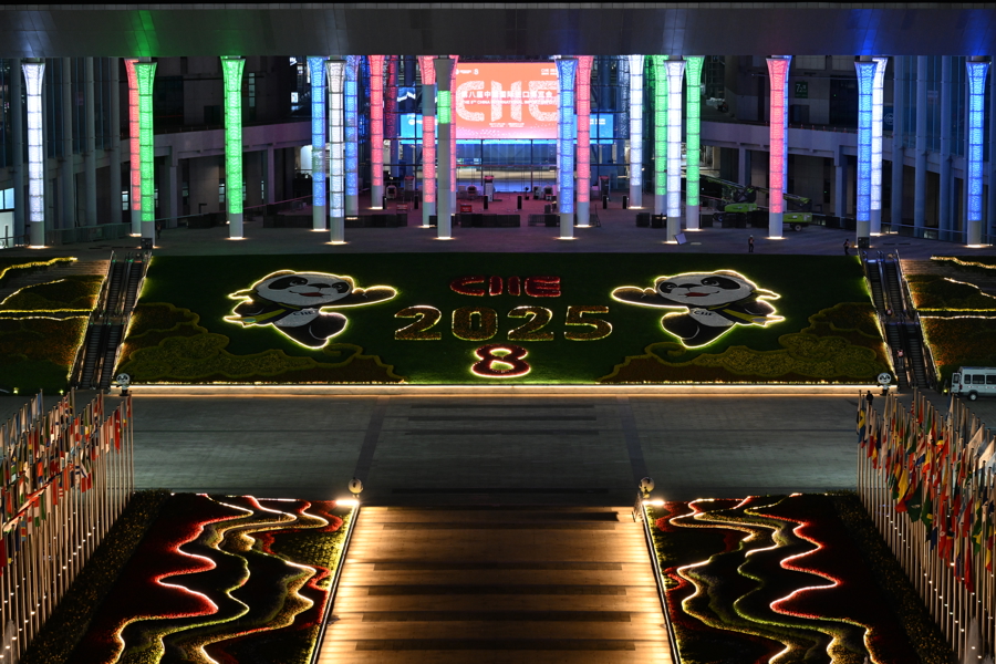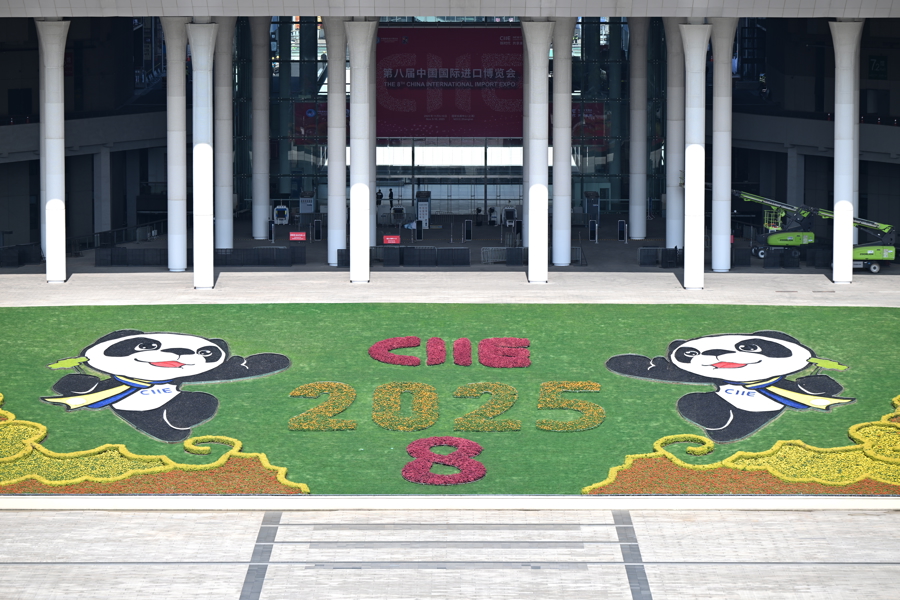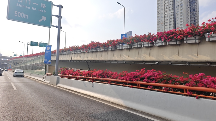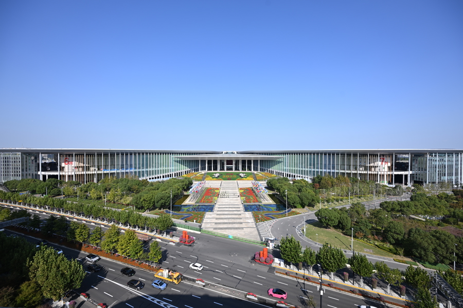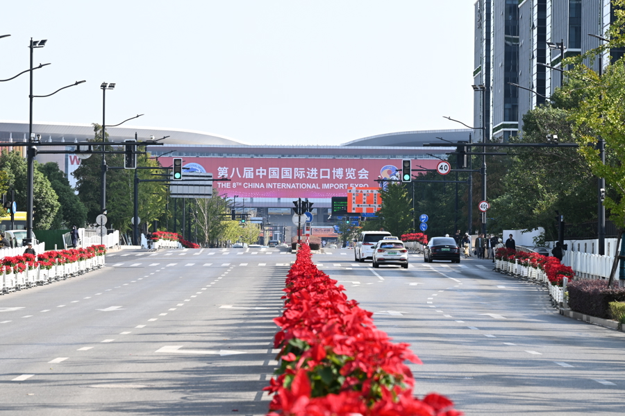 近日,国家会展中心(上海)南广场已完成8000多平方米绿化景观布置,展现上海正以开放的胸襟拥抱世界的姿态。连通虹桥国际中央商务区与进博会主场馆的二层步廊布置了花箱、草花,烘托出热情洋溢的迎宾氛围。位于嘉闵高架建虹路下匝口的“一带一路”“大进宝”则用一抹嫣红迎接进博客商,虹许路虹桥路口的“花珠汇海”以及不远处的“虹桥之眼”喜迎各方嘉宾。
