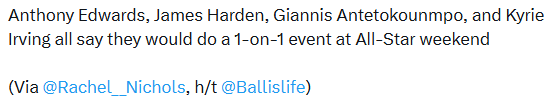 虎扑02月17日讯 今日,据知名记者Rachel Nichols报道,在刚刚结束的2026年NBA全明星周末后,森林狼球星安东尼-爱德华兹、骑士后卫詹姆斯-哈登、雄鹿前锋扬尼斯-阿德托昆博以及独行侠后卫凯里-欧文均表示,他们愿意在未来的全明星周末参加1对1单挑赛事。