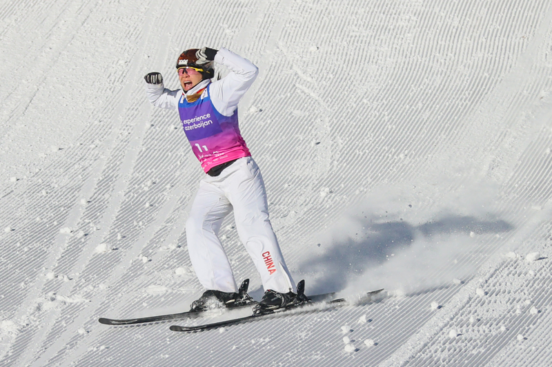 2025年12月21日,中国一队选手徐梦桃在决赛中完成动作后庆祝。最终,由徐梦桃、李天马、齐广璞组成的中国一队获得冠军。\n 当日,国际雪联自由式滑雪空中技巧世界杯(云顶站)混合团体项目比赛在河北省张家口市崇礼区云顶滑雪场进行。\n 新华社发(武殿森摄)